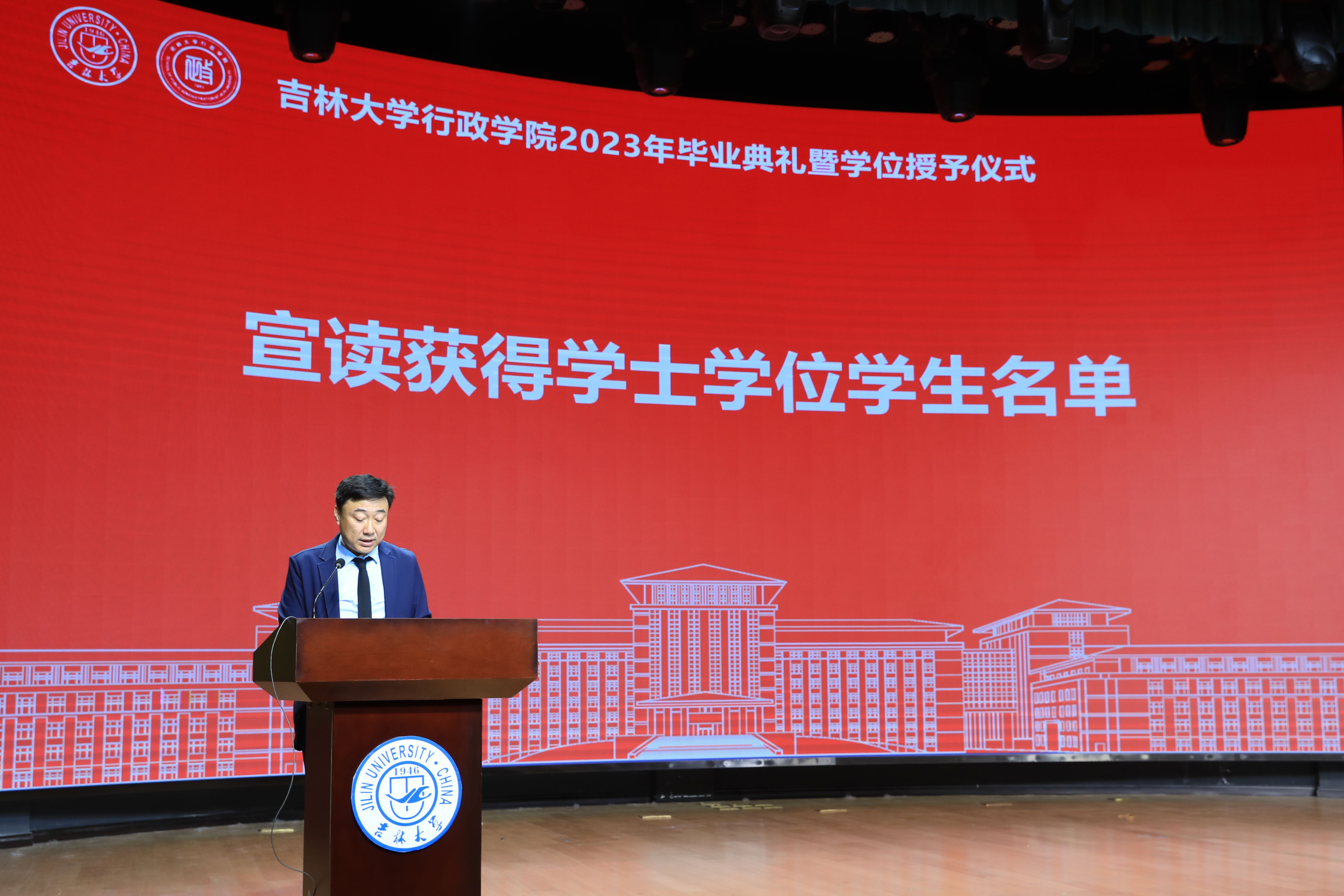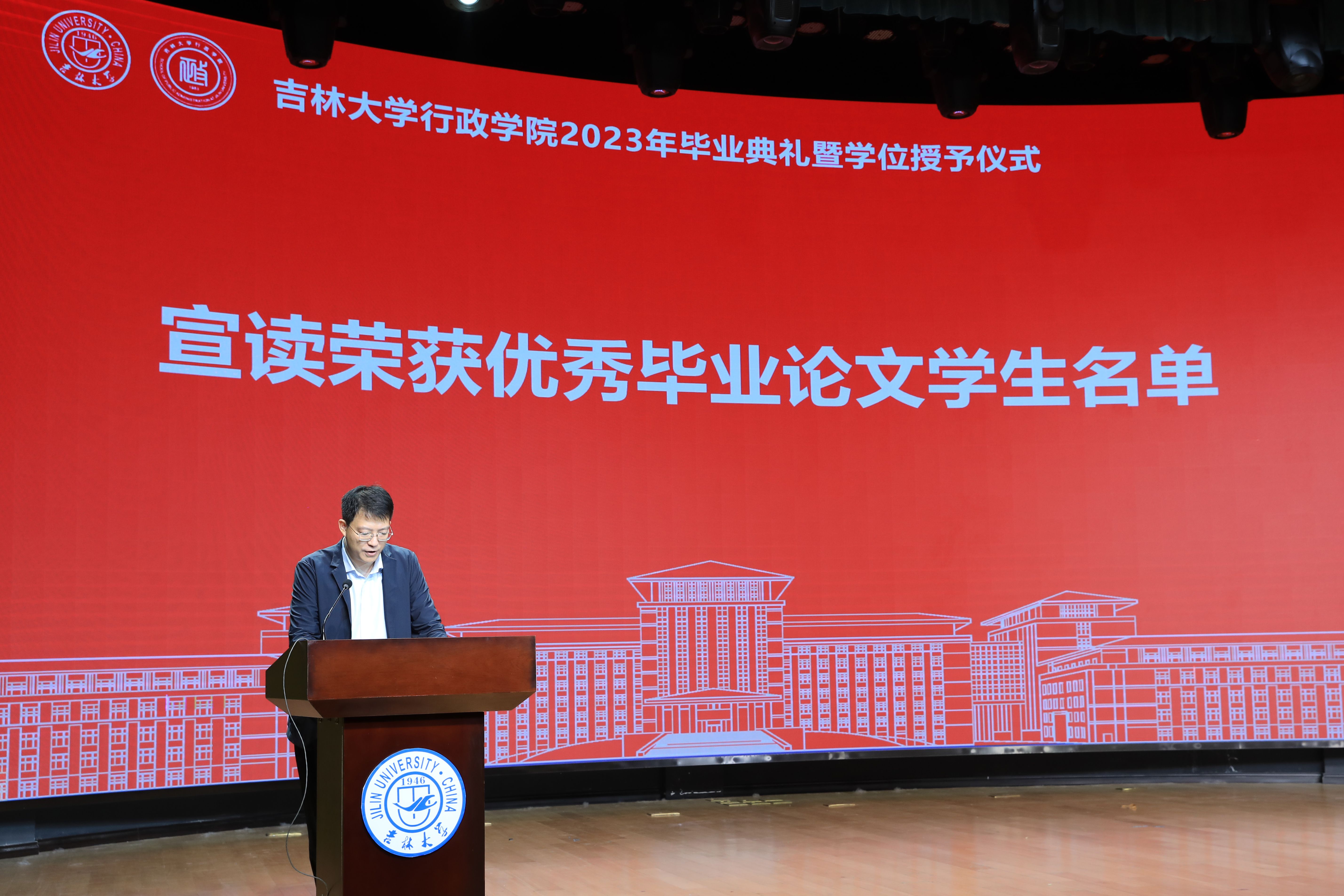 毕业典礼暨学位授予仪式伴随师生齐声高唱国歌拉开序幕。2023年是吉林大学政治学学科恢复重建暨行政学院成立40周年,与会人员沉浸在学院40年建设成就巡礼宣传片展示的一张张老照片、一座座里程碑,共同回顾峥嵘岁月,展望大好前景。饱含对毕业生的祝福和希冀,副院长刘雪华教授宣读2023届毕业研究生名单,副院长于海洋教授宣读2023届本科毕业生名单,副院长马雪松教授宣读2023年优秀毕业论文及优秀指导教师名单,党委副书记史慕华教授宣读2023届优秀毕业生名单,党委书记陈希贵为优秀毕业生颁发荣誉证书。