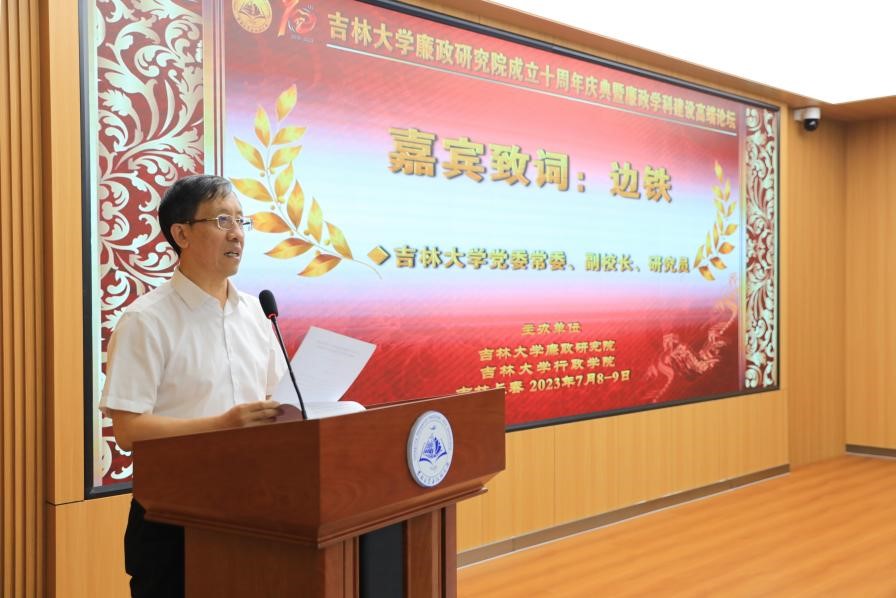 吉林大学党委常委、副校长边铁在致辞中代表姜治莹书记、张希校长,向与会各位专家学者表示热烈的欢迎。边铁表示,吉林大学作为党亲手创建并布局在东北的重点综合性大学,始终高度关注全面从严治党、党风廉政建设等重大理论与现实问题,在吉林省纪委监委和吉林大学党委的领导与支持下,廉政研究院聚焦于国家和地方党风廉政建设和反腐败工作的重大需求,经过十年的持续探索和辛勤建设,在理论研究、人才培养、咨政建言、交流合作等各方面取得显著成就。边铁表达了对各位专家学者莅临指导的感谢,并预祝论坛圆满成功。