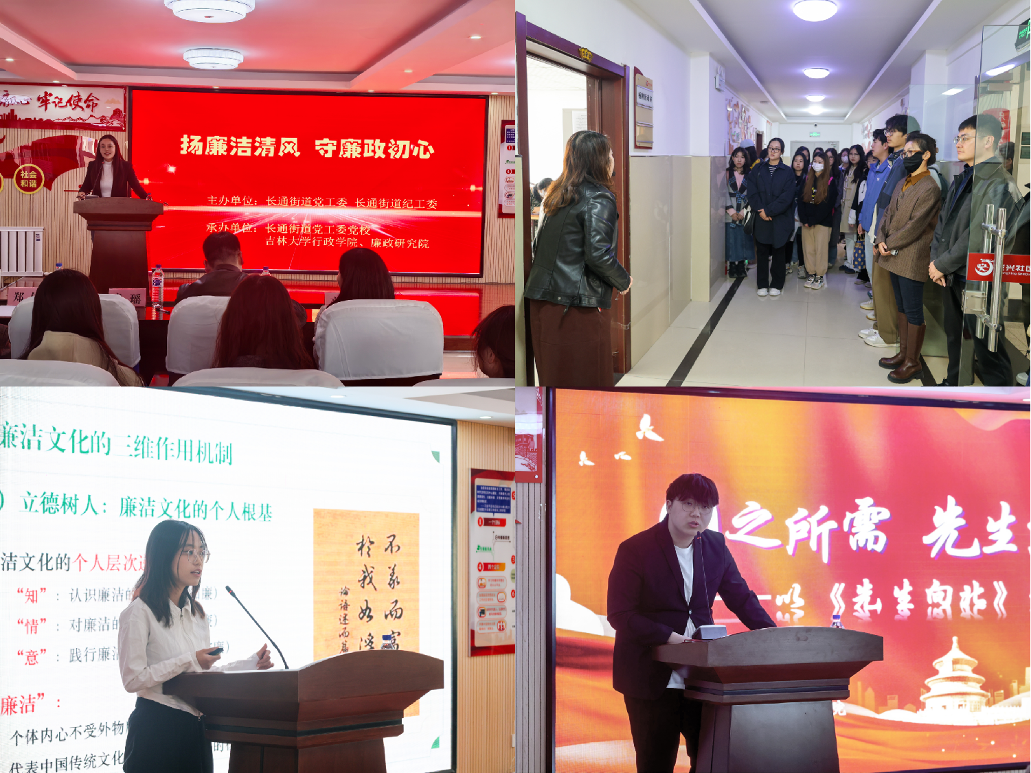 学院廉政学研究生王琪以《立体复合式基层廉洁文化建设》为题,介绍吉林大学廉政文化以及廉洁文化建设提炼出的经验及启示;学院本科生唐恩泽以《国之所需 先生所赴》为题,向与会成员汇报吉林大学北上精神,展现先生们听党召唤、至诚报国、扎根东北、兴教育才的生动画面。