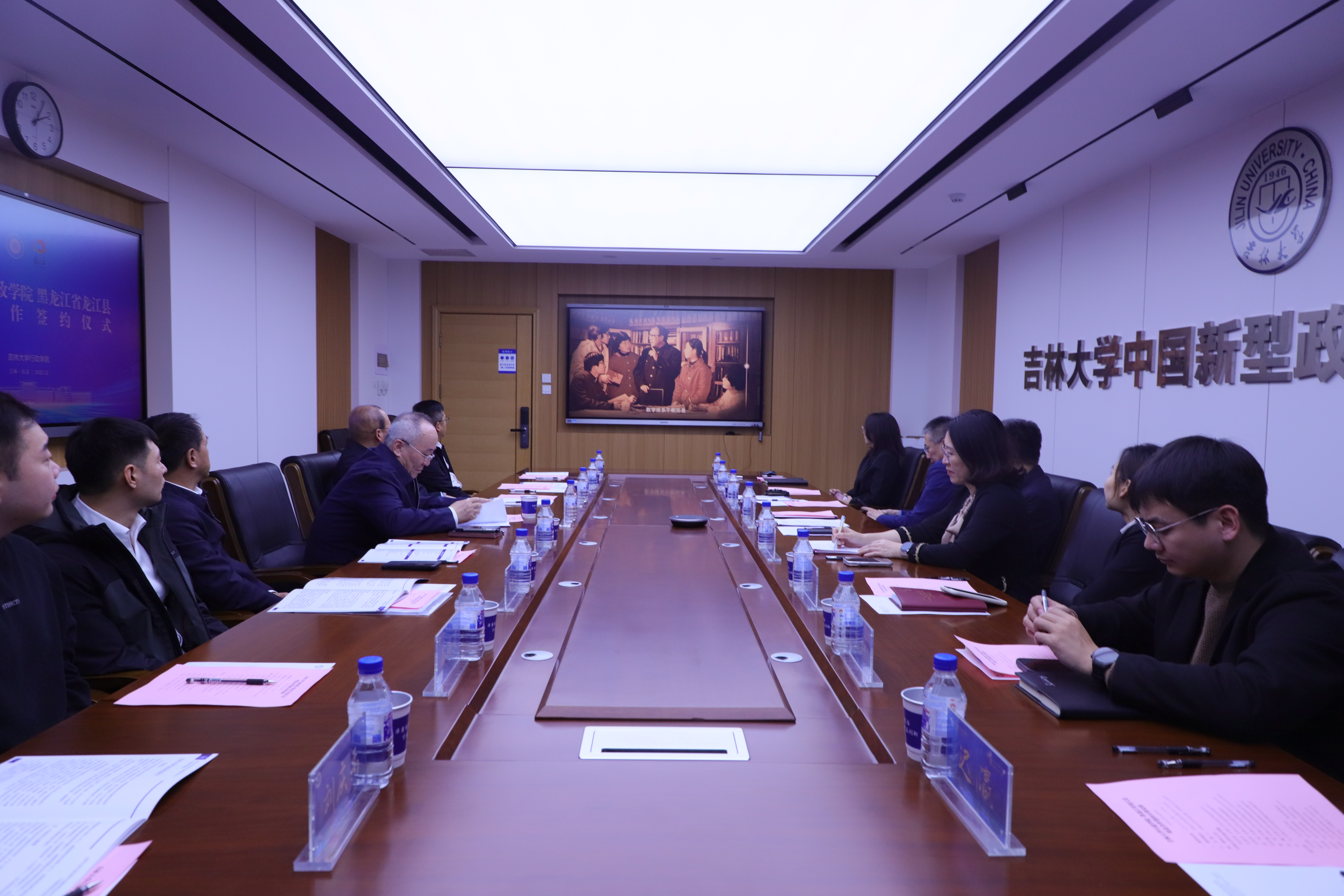 2025年12月15日,吉林大学行政学院与黑龙江省龙江县在吉林大学行政学院举办校县合作座谈会暨签约仪式。吉林大学行政学院党委书记陈希贵,党委副书记史慕华,副院长刘雪华,龙江县委书记关宝建,县委常委、组织部部长张红玉,县委常委、县委办公室主任夏洪刚等相关领导出席会议。会议由吉林大学行政学院党委副书记史慕华主持。