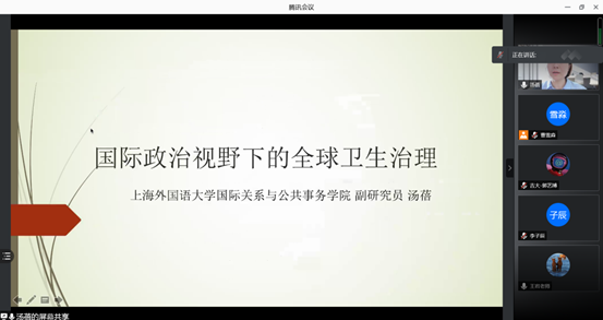 2021年6月15日下午14时,由吉林大学行政学院主办的国际事务工作坊第十期学术活动,在腾讯会议室举行。本次讲座邀请上海外国语大学国际关系与公共事务学院副研究员、上海市晨光学者汤蓓担任主讲嘉宾,作了题为“国际政治视野下的全球卫生治理”的学术讲座。吉林大学行政学院讲师王岩担任主持人,参加者包括行政学院部分教师、研究生及本科生共二十余人。
