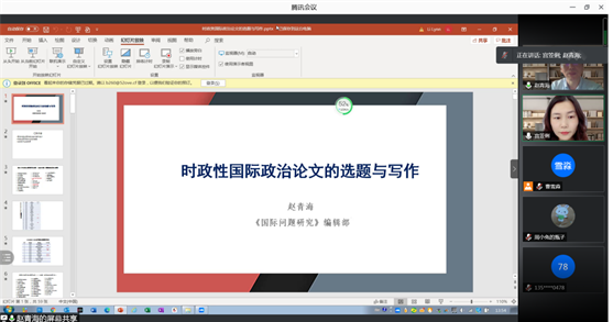 2021年6月8日14时,由吉林大学行政学院主办的教师科研水平提升计划第二十五期活动在腾讯会议室举行。本次讲座邀请《国际问题研究》执行主编、中国国际问题研究院海洋安全与合作研究中心主任赵青海研究员担任主讲嘉宾,作题为“时政性国际政治论文选题与写作”的学术讲座。吉林大学行政学院宫笠俐教授担任主持人,行政学院部分教师、研究生及国内其他高校师生共八十余人参加此次讲座。