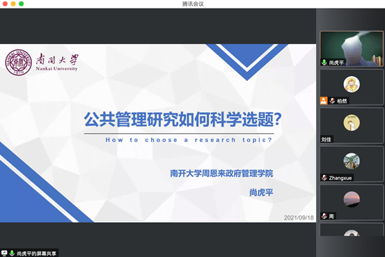 2021年9月18日,吉林大学行政学院主办的吉林大学庆祝建校75周年系列学术活动暨第十期学术沙龙活动在腾讯会议室举行。本次沙龙主题为“社会科学科学性研究的选题、设计与方法”,南开大学周恩来政府管理学院博士生导师、南开大学中国政府绩效管理研究中心主任、南开大学中国政府发展联合研究中心研究员尚虎平教授,中国人民大学公共管理学院博士生导师、国家发展与战略研究院研究员马亮教授以及首都师范大学燕京学者特聘教授、哈佛大学费正清中心协作研究员、北京大学国家治理研究院研究员赵新峰教授应邀担任主讲嘉宾。吉林大学行政学院丁建彪副教授主持沙龙,他引述科学学创始人贝纳尔与社会科学家默顿和波普尔关于科学研究的思考与观点,谈及本次学术沙龙的主题内容与活动意义,并对三位教授的学术履历及代表性研究成果予以介绍。行政学院部分教师、研究生、本科生及国内其他高校师生共九十余人参与本次沙龙。