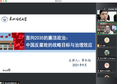 2021年9月23日,吉林大学行政学院与吉林大学廉政研究院共同主办的吉林大学庆祝建校75周年系列学术活动暨第11期名家讲座以视频会议方式举行。东北师范大学政法学院院长、东北师范大学廉政研究中心副主任李红权教授应邀担任主讲嘉宾,作题为“面向2035的廉洁政治:中国反腐败的战略目标与治理效应”的学术讲座。行政学院党委书记马景惠主持讲座,行政学院副院长马雪松教授担任评议人,行政学院部分教师、研究生、本科生及国内其他高校师生共四十余人参加此次讲座。