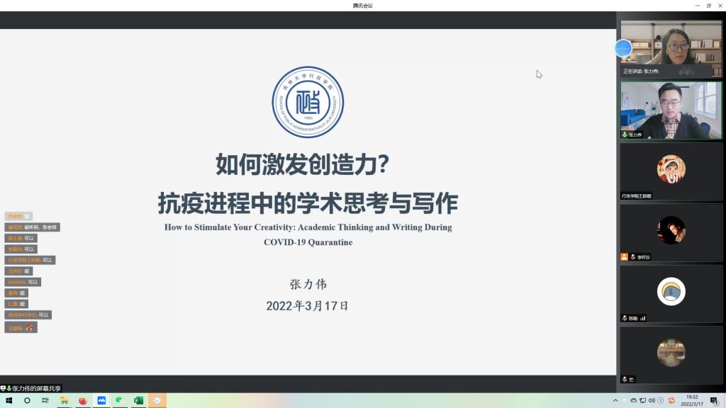 2022年3月17日,吉林大学行政学院主办的“研究生学术能力提升计划”系列学术活动在腾讯会议平台进行,本次活动邀请到吉林大学匡亚明青年学者、行政学院张力伟老师担任主讲嘉宾,进行题为“如何激发创造力?抗疫进程中的学术思考与写作”的学术报告。共有150余名来自吉林大学、东北师范大学等高校的教师、研究生与本科生参与了本次线上讲座。讲座由行政学院党委副书记史慕华教授主持。