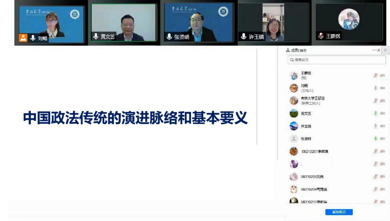 2022年5月6日,吉林大学廉政研究院、吉林大学行政学院主办的第7期清晏廉政名家讲坛学术活动在腾讯会议平台举行。中国人民大学法学院院长、博士生导师、教育部“长江学者”特聘教授、《中国法学》总编辑、中国比较法学研究会副会长黄文艺教授受邀担任主讲嘉宾,作题为“中国政法传统的演进脉络和基本要义”的学术讲座。吉林大学廉政研究与教育中心副主任、吉林大学行政学院博士生导师刘畅教授主持讲座,吉林大学、复旦大学、中国人民大学、武汉大学等近十所高校、科研院所的近四百名师生参与本次学术活动。