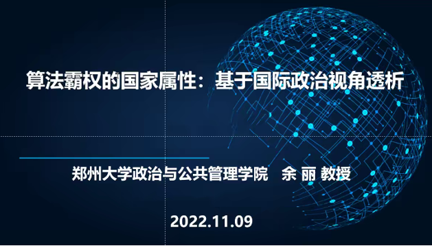 2022年11月9日晚间,吉林大学行政学院第24期名家讲座在腾讯会议平台举行。郑州大学政治学、国际政治学、国际公共事务管理与国家安全学科学术带头人,郑州大学国际公共安全研究中心主任、政治与公共管理学院副院长余丽教授受邀担任主讲嘉宾,作题为“算法霸权的国家属性——基于国际政治视角透析”的学术讲演。名家讲座由吉林大学行政学院副院长马雪松教授主持,来自吉林大学、南京大学、中山大学、厦门大学、郑州大学、东北师范大学、华中师范大学、天津师范大学、外交学院、上海外国语大学、大连理工大学等国内部分高校的150余名师生参与本次讲座。