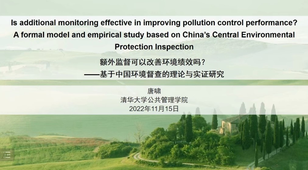 2022年11月15日,吉林大学行政学院为公论坛第43期学术讲座在腾讯会议平台举行。清华大学公共管理学院副教授、清华大学国情研究院副研究员、清华大学仲英青年学者、首届夏书章公共管理优秀博士论文奖获得者唐啸老师受邀担任主讲嘉宾,作题为“额外监督可以改善环境绩效吗?——基于中国环境督查的理论与实证研究”的学术讲演。本次讲座由吉林大学行政学院公共管理系魏素豪老师主持,吉林大学行政学院及国内部分高校教师和学生共90余人参与本次活动。