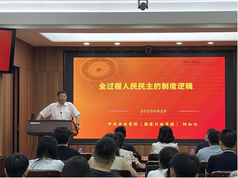 2025年6月29日上午,吉林大学行政学院、吉林大学社会科学研究院共同主办的吉林大学哲学社会科学学术讲座(总1244场),在东荣大厦B303报告厅开展。中共中央党校(国家行政学院)研究生院院长、第十四届全国政协委员、社会和法制委员会委员时和兴教授受邀担任主讲嘉宾,作题为“全过程人民民主的制度逻辑”的学术讲演。吉林大学行政学院党委副书记史慕华、吉林大学廉政研究院副院长田玉麒副教授以及行政学院本科生、研究生近80人参加讲座。吉林大学行政学院副院长、廉政研究院院长刘畅教授主持讲座。