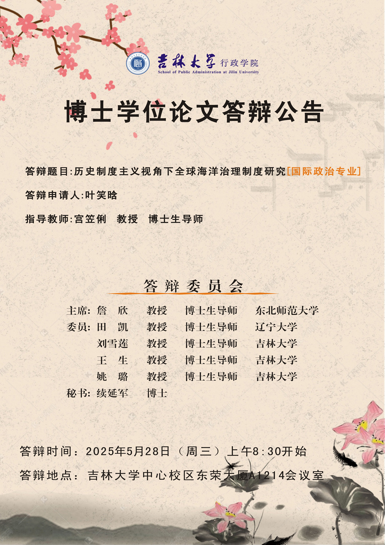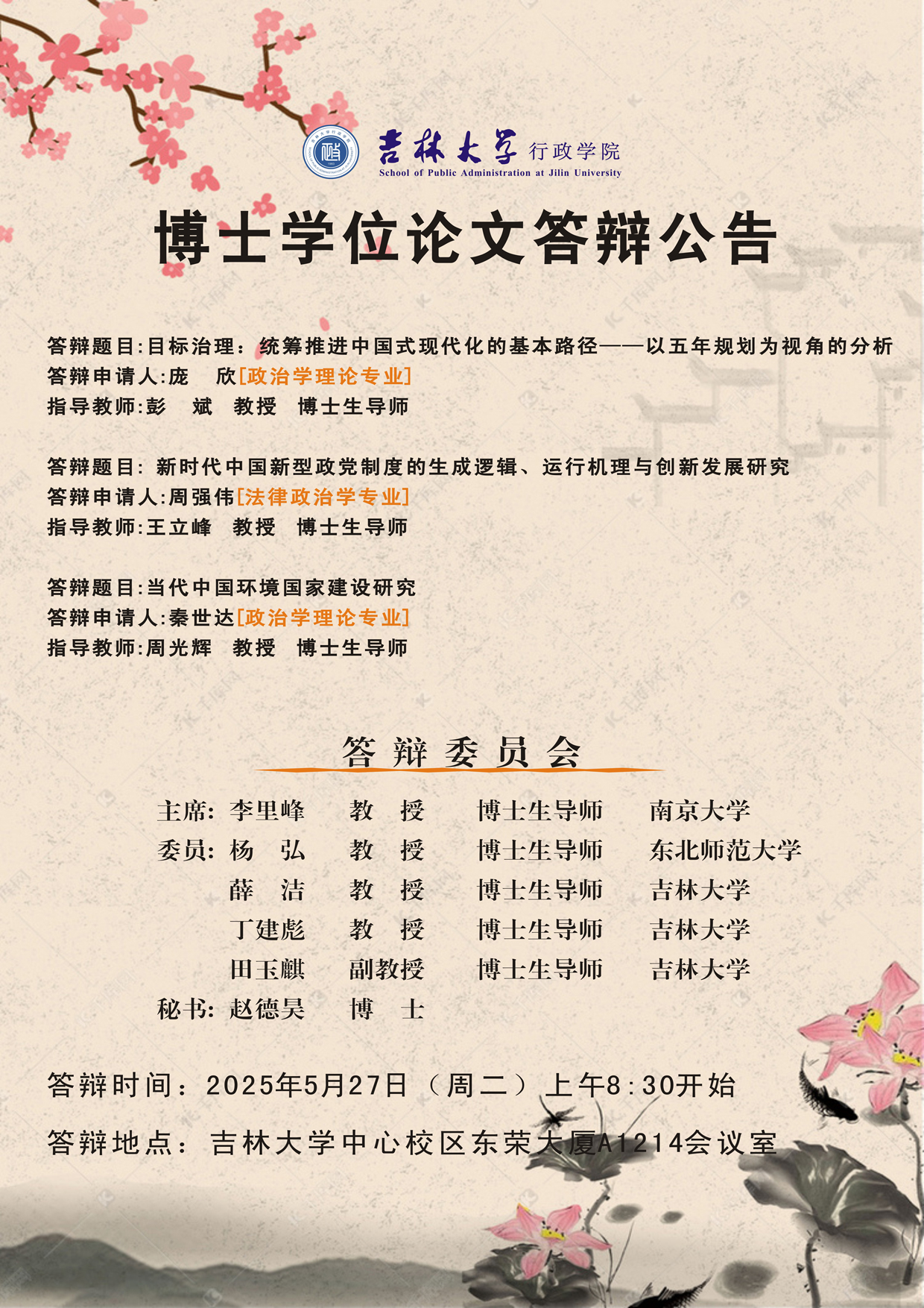 答辩地点:吉林大学中心校区东荣大厦A1214会议室