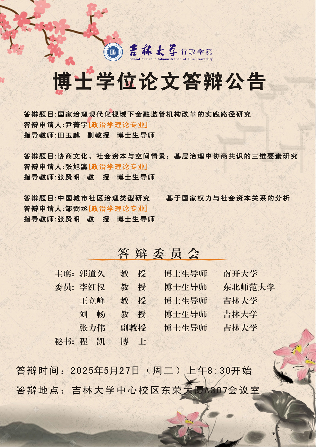 答辩地点:吉林大学中心校区东荣大厦A307会议室