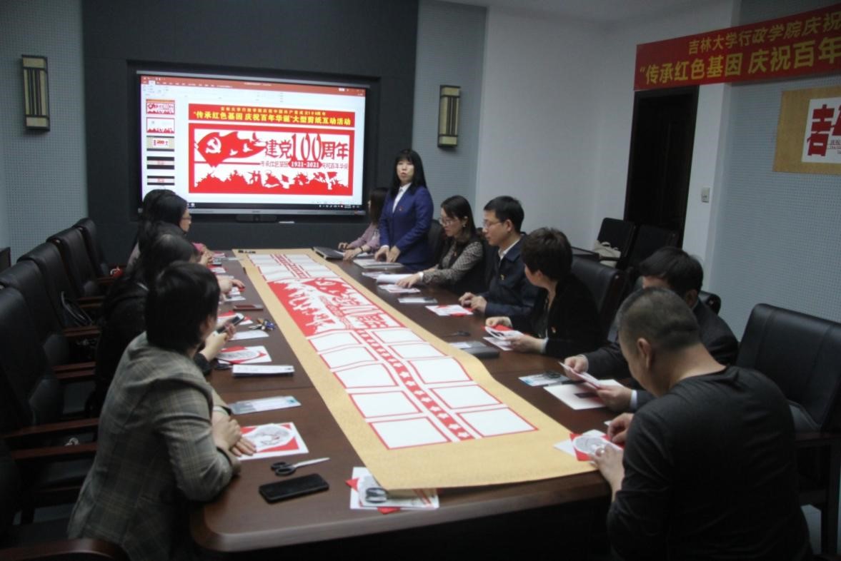 为庆祝建党100周年,表达对革命伟人的尊崇,汲取红色革命精神, 5月14日中午,行政学院妇委会联合工会在东荣大厦B304会议室举办“传承红色基因 庆祝百年华诞”主题剪纸活动。本次活动邀请吉林省博物院二级美术师马俊、中国民间剪纸艺术家马晶指导培训,我院20余名老师参加了本次实践活动,活动由党委副书记史慕华主持。