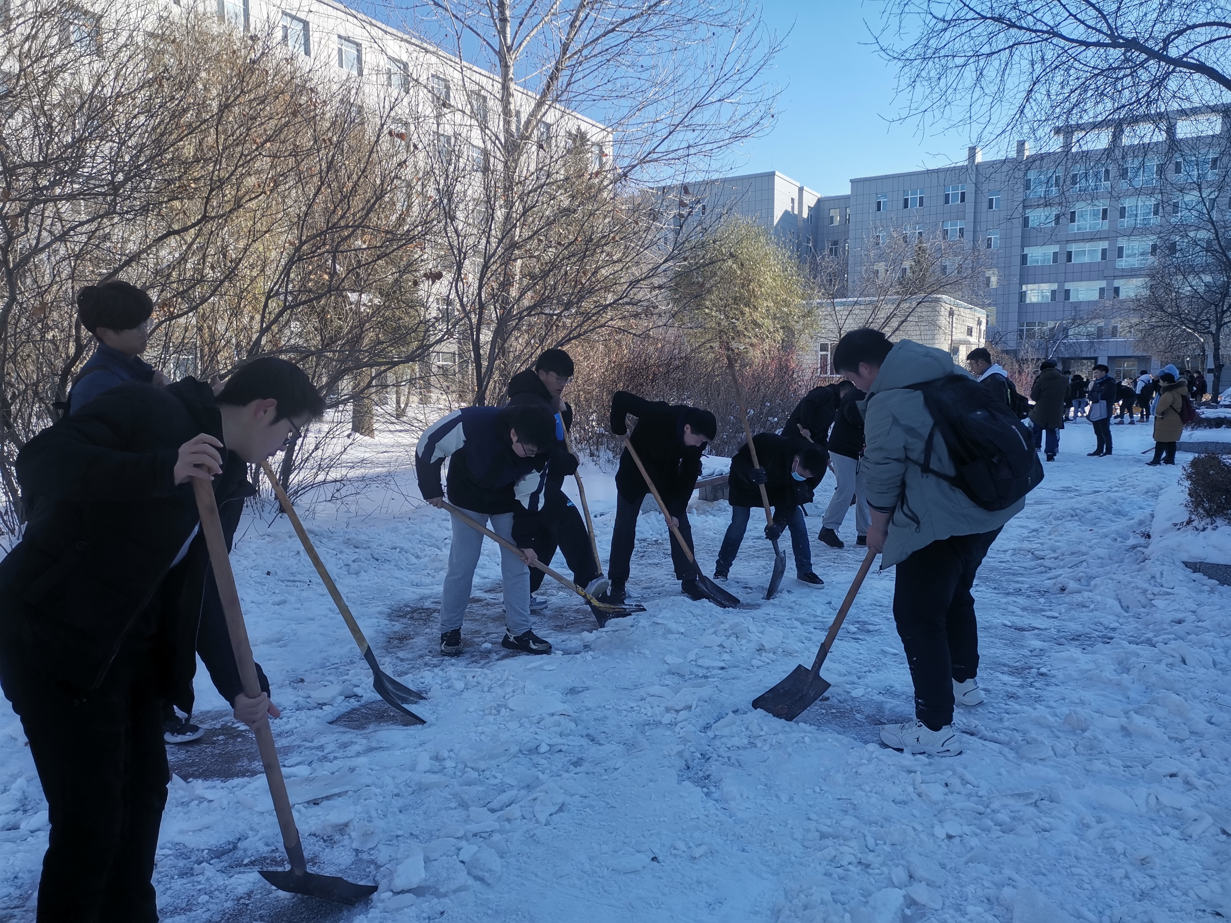 清雪现场,大家在克服一切困难,发扬不怕苦,不怕累的精神,手拿铁锹、笤帚干劲十足地投入到清雪战斗中,不畏寒冷,人人争先,为师生出行开辟出一条洋溢着温情的道路,充分展现了党员的服务风采,增强了党员队伍的凝聚力。