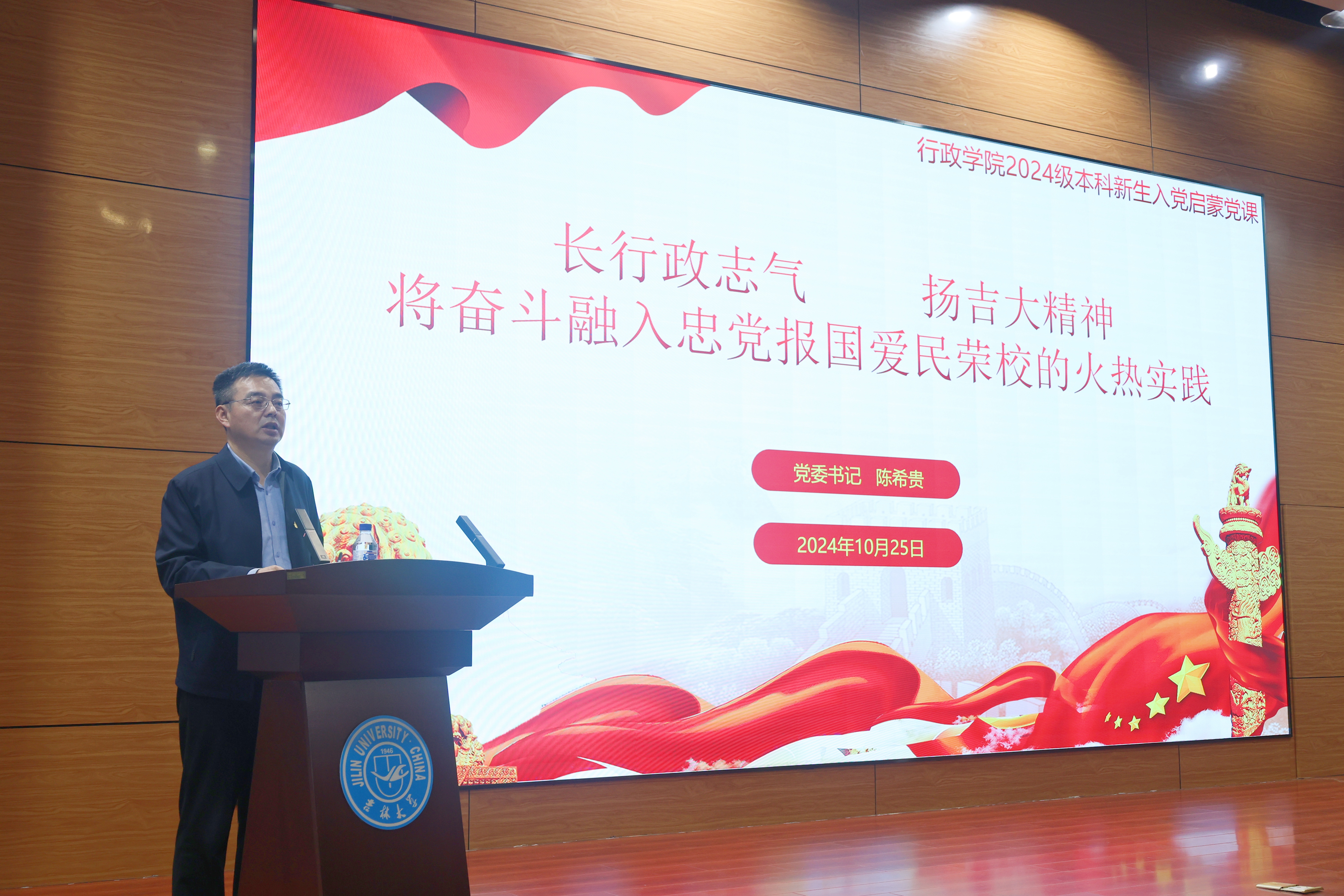 “追求政治进步,是青年最宝贵的特质,也是党和人民最殷切的希望。大学生朋友们要认真接受政治训练、加强政治锻造、追求政治进步,积极向党组织靠拢,以成长为一名合格的共产党员为目标、为光荣。”10月25日,行政学院党委书记陈希贵在国际学术大讲堂为2024级本科新生讲授入党启蒙党课。