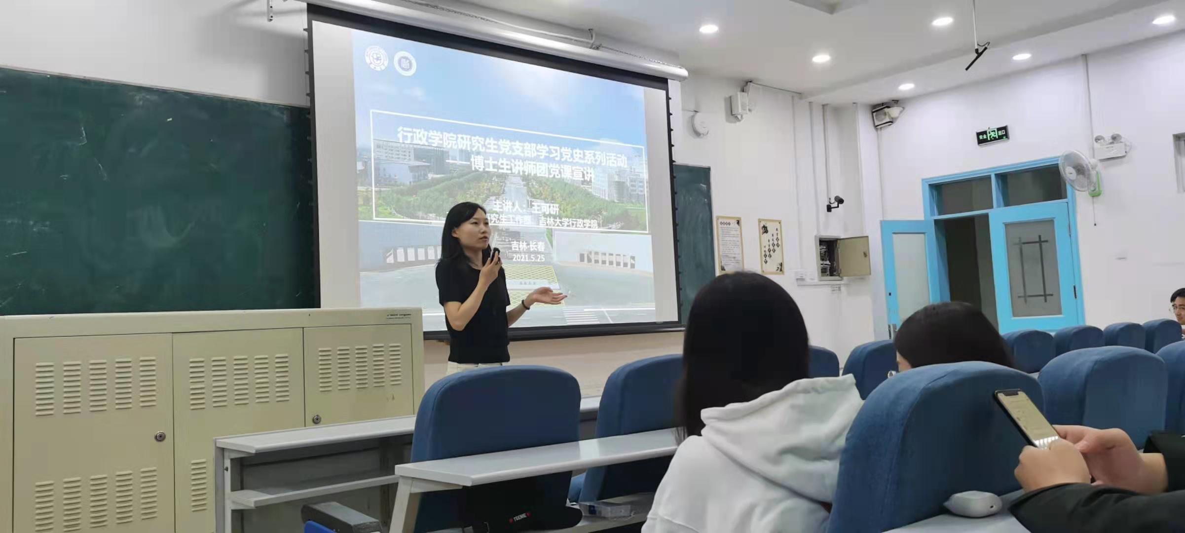 2021年5月25日行政学院研究生党支部于中心校区第三教学楼第二阶梯教室举办了“行政学院研究生党支部学习系列活动之博士生讲师党课宣讲”。本次党课宣讲在吉林大学研究生工作部的指导支持下,以“靖宇精神的内涵与当代价值”为主题,由我校博士讲师团的中国近现代史基本问题研究专业博士生王可妍主讲。本次党课宣讲会不仅党员同学全部到场,发展对象、积极分子和其他党外同学也积极地参与了此次活动,本次党课由行政学院研究生辅导员高琛老师主持。