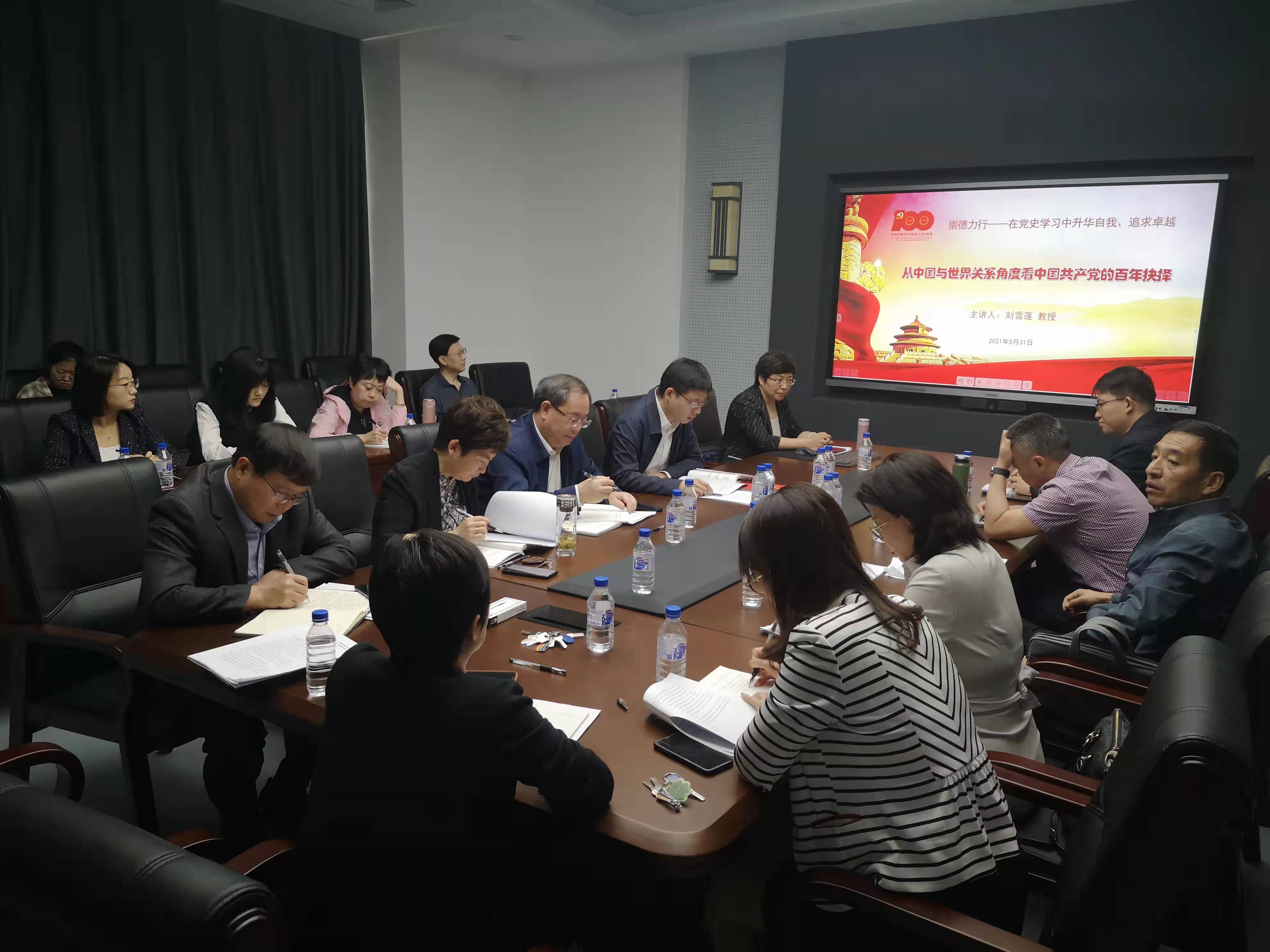 按照行政学院党委理论学习中心组党史学习教育第一阶段学习计划,5月31日上午,行政学院党委理论学习中心组在东荣大厦B304会议室召开“崇德力行——在党史学习中升华自我,追求卓越”专题学习研讨会。学院邀请刘雪莲教授做题为“从中国与世界关系角度看中国共产党的百年抉择”专题导学报告,学院领导班子成员、党委委员、国际政治学系党员参加了本次集中学习研讨,学校党史学习教育第4指导组列席研讨会并作指导。会议由党委书记马景惠主持。