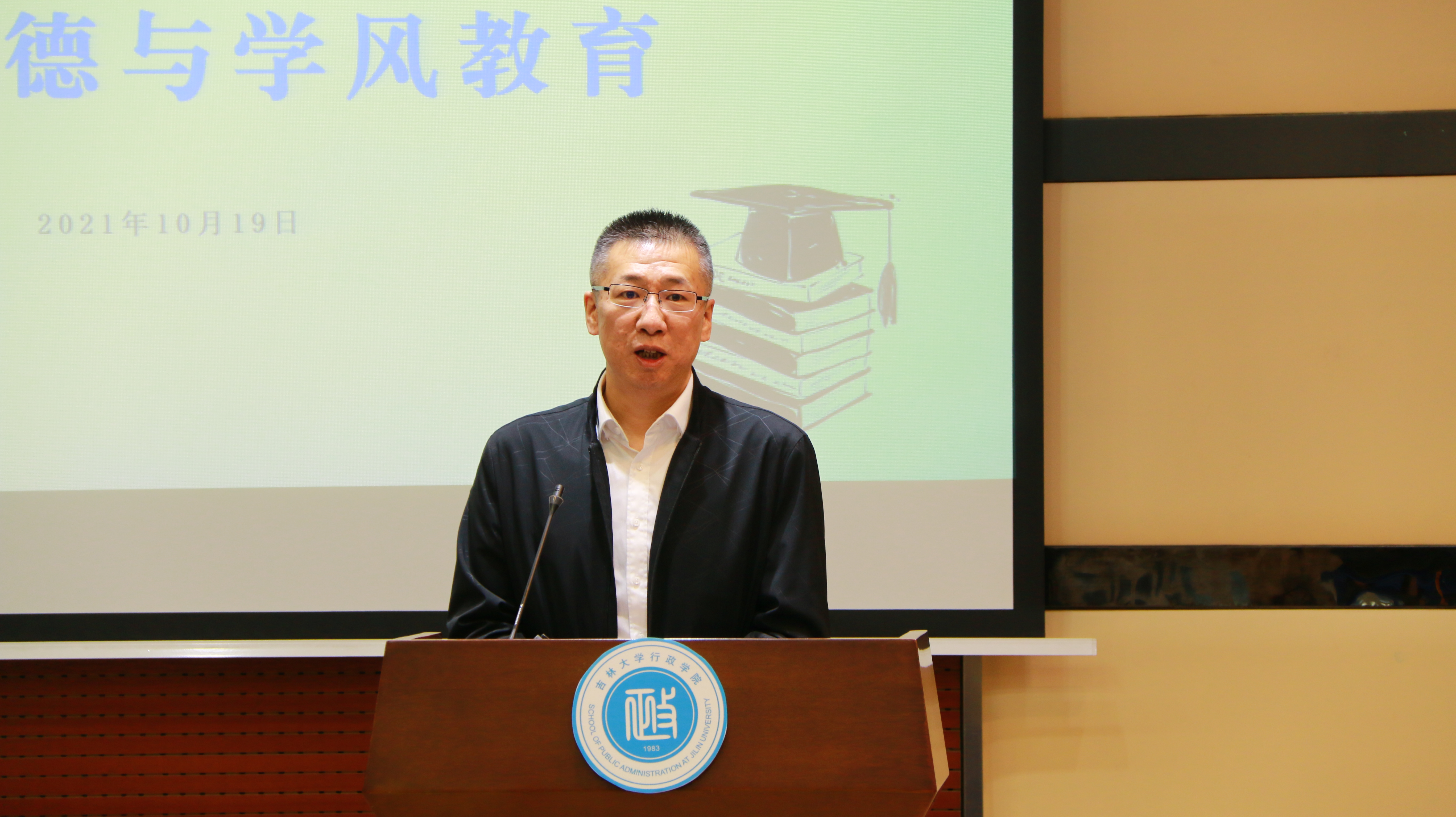 为贯彻落实教育部“加强科学道德和学风建设宣讲教育,提升高校哲学社会科学工作者学术情怀和学术操守”的工作要求,推动建设集教育、预防、监督、惩治于一体的学术治理与诚信管理体系,10月19日,行政学院在东荣大厦B310报告厅开展“科学道德与学风建设”专题宣讲会,学院副院长刘雪华教授进行主讲,全体2021级研究生新生参与活动。