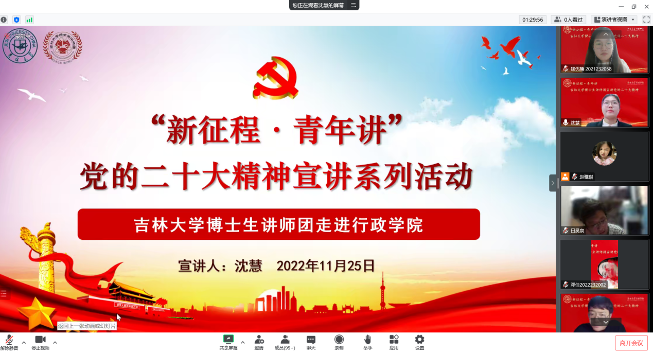 为深入学习贯彻党的第二十次全国代表大会精神,进一步强化我院研究生的思想政治教育,坚定我院研究生的理想信念。2022年11月25日,在吉林大学党委研究生工作部的指导支持下,我院邀请到校博士生讲师团成员沈慧博士开展“新征程·青年讲”党的二十大精神宣讲活动。行政学院硕士学生党支部全体党员、发展对象和积极分子在内的170余人参加此次党课。