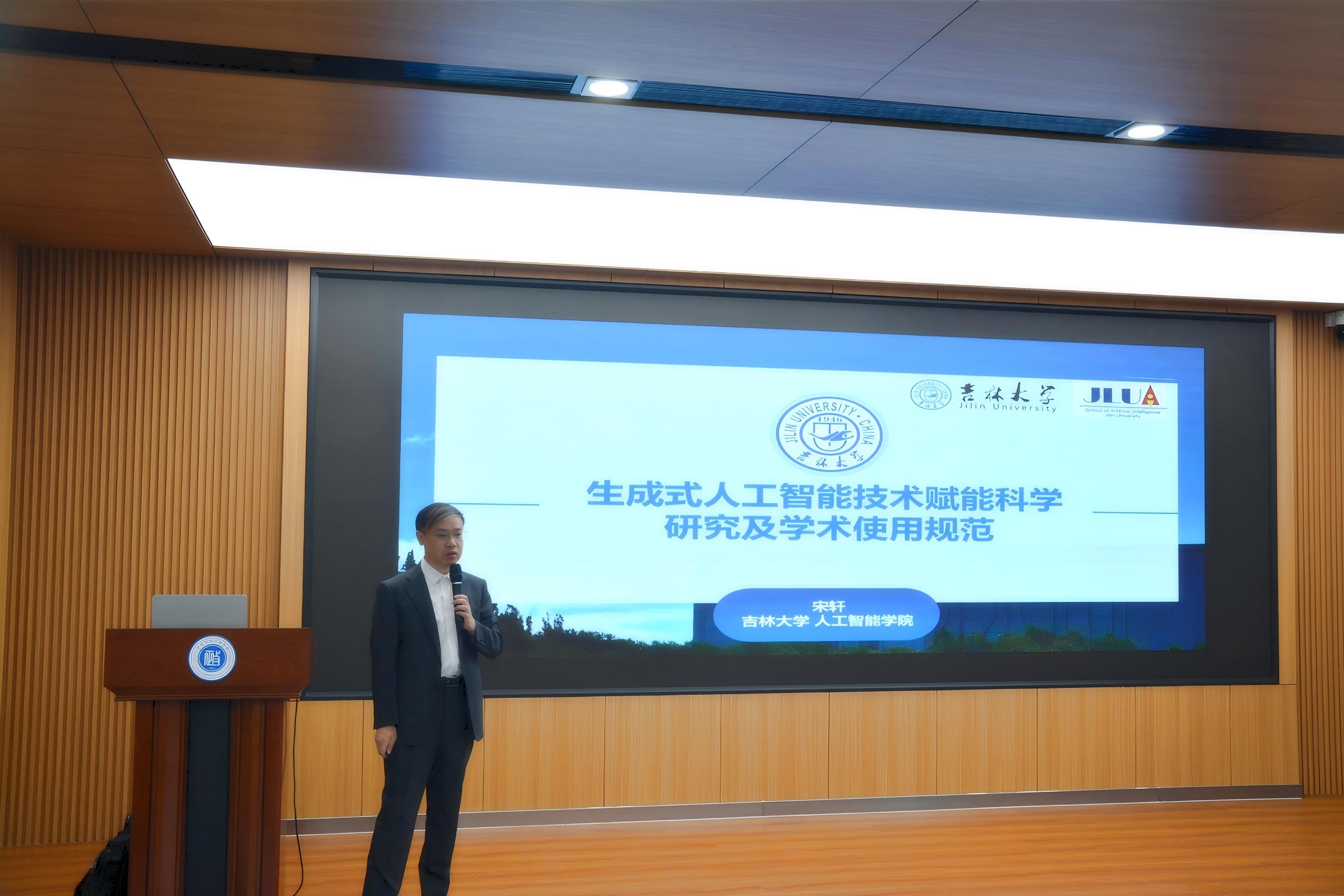 2025年6月11日,吉林大学行政学院在东荣大厦B102会议室开展政治学与公共管理学“名家引领”研究生精品课程(第九期)。吉林大学人工智能学院院长、博士生导师宋轩教授应邀担任主讲嘉宾,为同学们带来题为“生成式人工智能技术赋能科学研究及学术使用规范”的课程。行政学院副院长、廉政研究院院长刘畅教授主持本次课程,刘畅对宋轩的到来表示了热烈欢迎和衷心感谢,并介绍了宋轩的学术经历和成就。