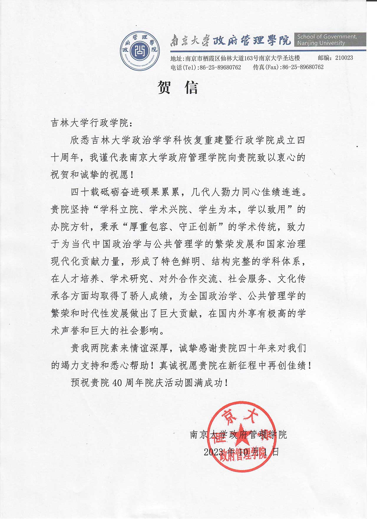 南京大学政府管理学院的贺信