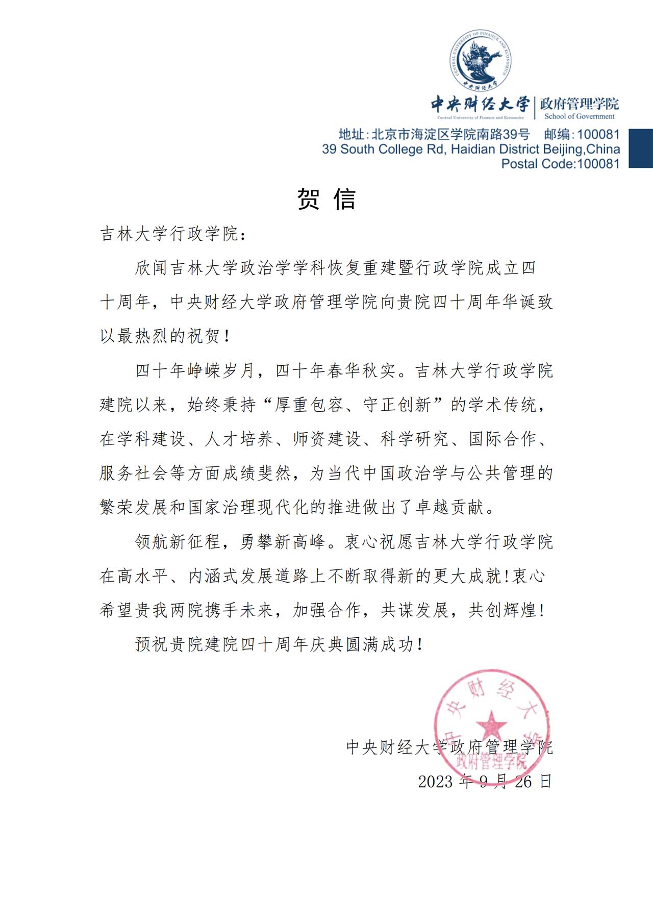 中央财经大学政府管理学院的贺信