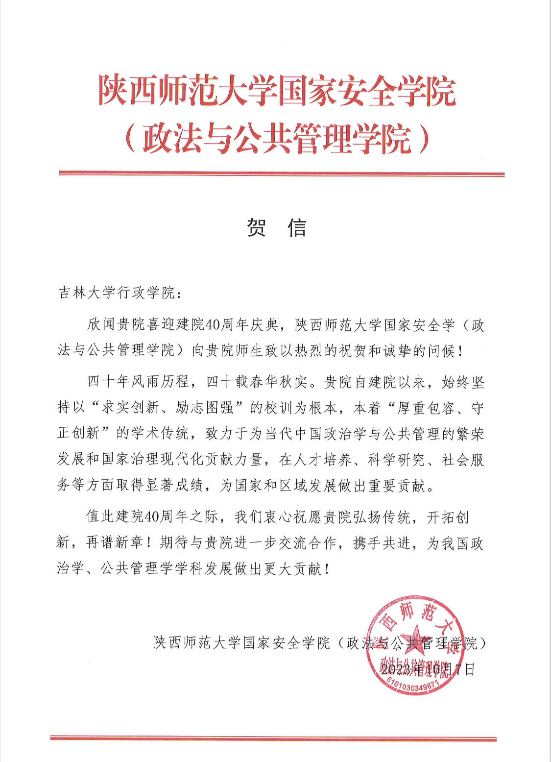 陕西师范大学国家安全学院的贺信