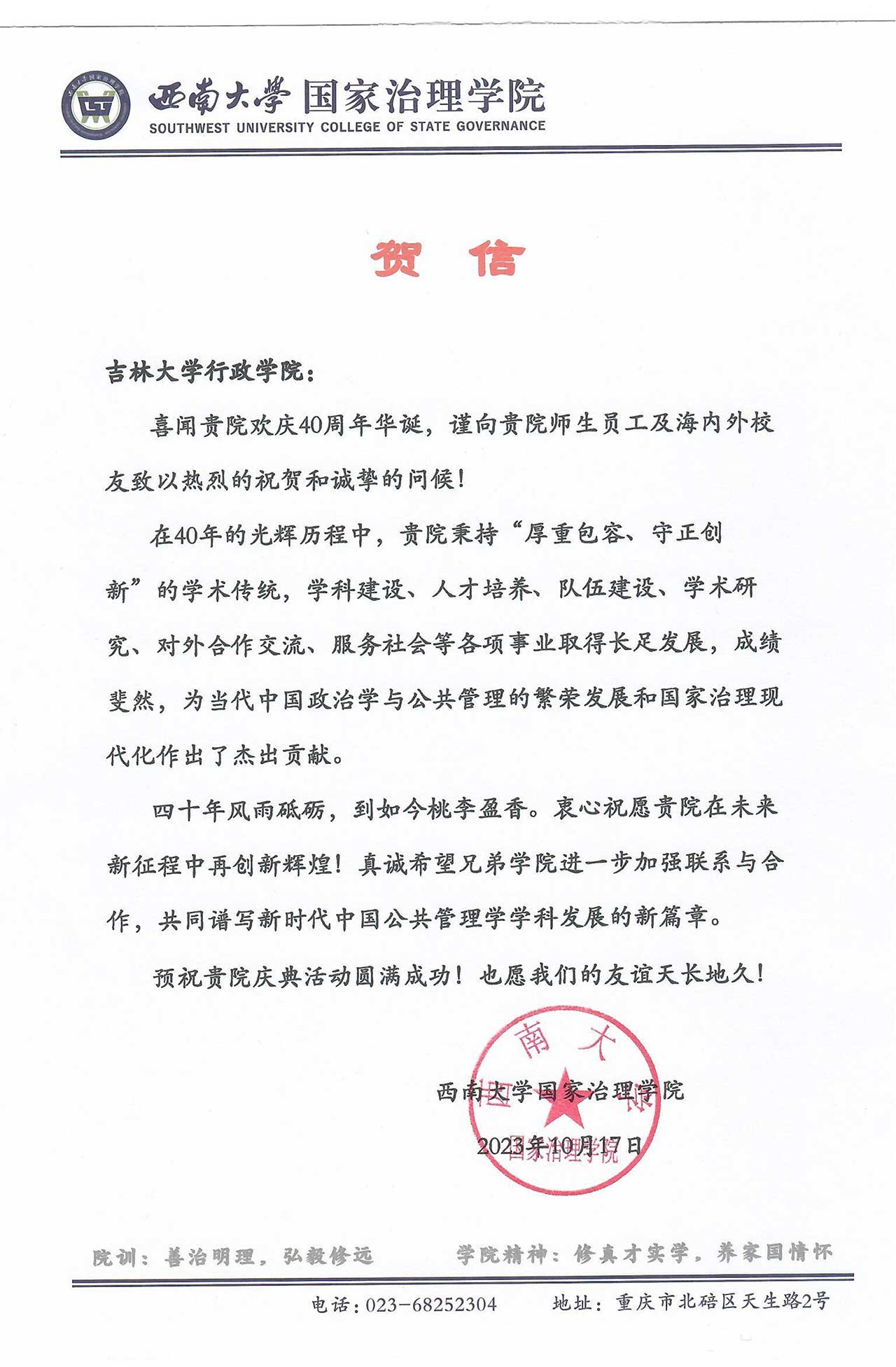 西南大学国家治理学院的贺信