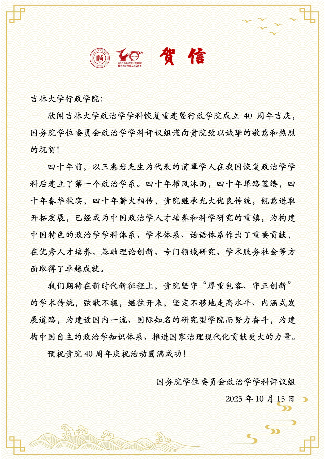国务院学位委员会政治学学科评议组的贺信