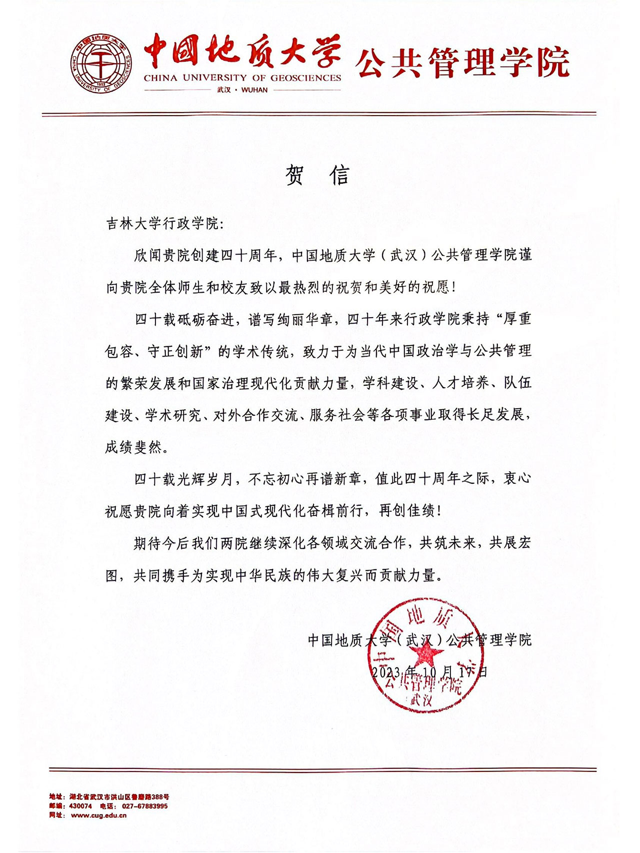中国地质大学(武汉)公共管理学院的贺信