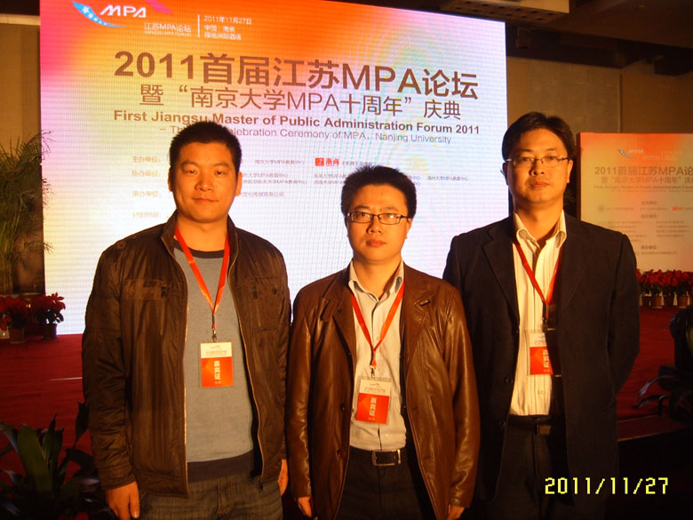 由南京大学政府管理学院、南京大学MPA教育中心、《浙商》杂志社共同主办的2011首届江苏MPA论坛暨南京大学MPA教育十周年庆典于2011年11月27日在南京绿地洲际酒店举行。我院MPA教育中心副主任王郅强副教授和2007级张斌阳、2008级唐克两位MPA研究生代表受学院委派参加了此次论坛与庆典。