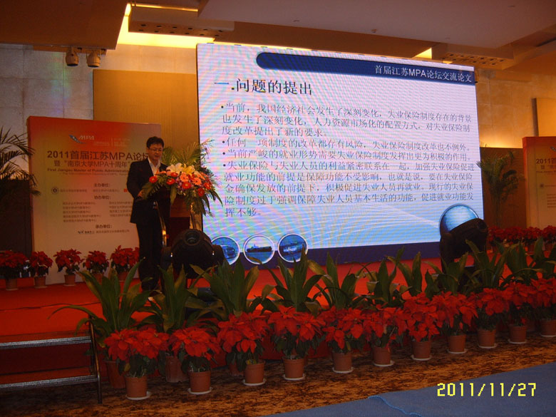 2011首届江苏MPA论坛议题主要有三项:一是促进就业与构建和谐劳动关系;二是如何解决中小企业融资难困境;三是如何以社会管理创新推进和谐社会建设。唐克同学和张斌阳同学的论文被收录到首届江苏MPA论坛论文集,唐克同学还在论坛上做了主题为“中国失业保险促进就业功能研究”的演讲,受到与会领导和MPA同仁们的一致好评,为吉林大学争得了荣誉。