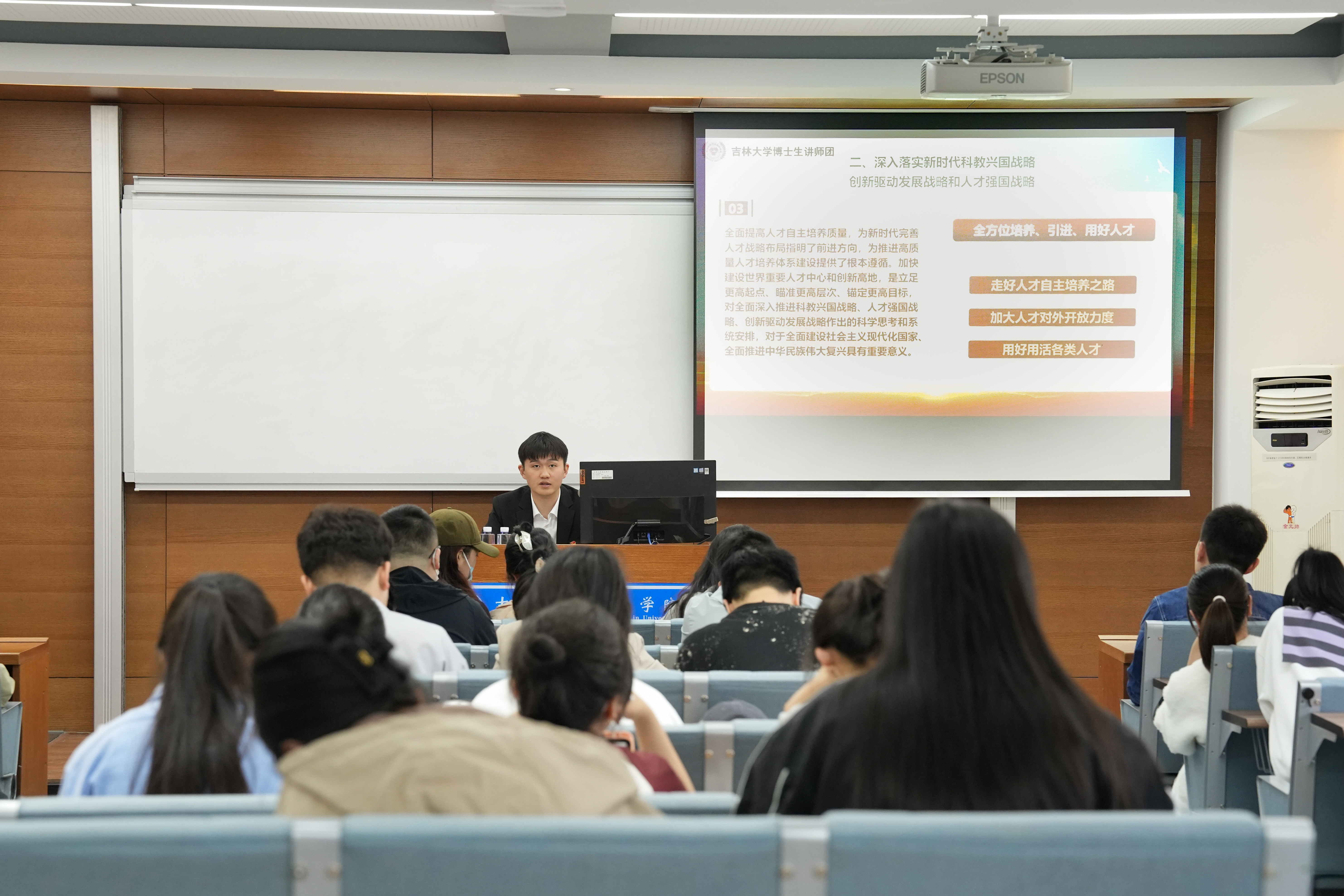 为深入学习贯彻全国两会精神,充分发挥博士生讲师团理论宣讲作用,2024年5月16日,吉林大学博士生讲师团讲师王嘉玮走进吉林大学行政学院开展“学习贯彻两会精神 聚力中国式现代化”宣讲系列活动。本次宣讲的题目是“坚持教育科技人才强国建设一体化推进,注入新质生产力发展澎湃动能”。行政学院部分研究生参加了本次活动。